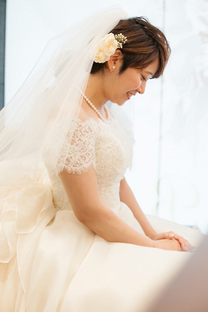 ドレスを着てはにかんでいるご新婦さまのこの表情も、きっと特別。いつものママの顔から花嫁さんの顔に。^^(なんだかキュンとしました。)